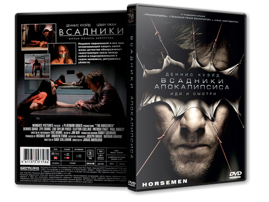 Год выпуска: 2009 Страна: США Слоган: «Four victims. Four painful secrets.» Жанр: триллер, драма, криминал, детектив Продолжительность: 01:30:13 Перевод: Профессиональный (многоголосый, закадровый)Режиссер: Йонас Акерлунд Сценарий: Дэйв Каллахэм Продюсер: Майкл Бэй, Эндрю Форм, Брэдли Фуллер Оператор: Эрик Бромс Композитор: Ян А.П. Качмарек В ролях: Деннис Куэйд, Чжан Цзыи, Лу Тэйлор Пуччи, Клифтон Коллинз мл., Бэрри Шебака Хенли, Патрик Фьюджит, Эрик Бальфур, Пол Дули, Томас Митчел, Лайам ДжеймсБюджет: $20 000 000 Сборы в мире: $2 405 815Описание: Недавно овдовевший и всё ещё оплакивающий смерть жены, коп Эйдан Бреслин всё больше уединяется в своём горе и отдаляется от своих сыновей. На работе же он находит себя в расследовании ужасных и извращённых убийств, основанных на библейском пророчестве о Четырёх Всадниках Апокалипсиса. Постепенно, продвигаясь в расследовании, он начинает понимать, что существует прямая связь между этими убийствами и им самим... MPAA: Релиз: Раздача группы: Качество: DVD5 (сжатый) Формат: DVD Video Видео: MPEG2; PAL 16:9 (720x576) Аудио #1: Dolby AC3, 6 ch, 384 Kbps Russian Аудио #2: Dolby AC3, 6 ch, 384 Kbps English Субтитры: русскиеДополнительная информация : Исходник : DVD9 (5.9 Гб) [лицензия, PAL 16:9] Убрано : допы, реклама, заставки, предупреждения Сжатие фильма : 12.4 % сжатия (без учета ручного перераспределения битрейта, за счет большего сжатия конечных титров)