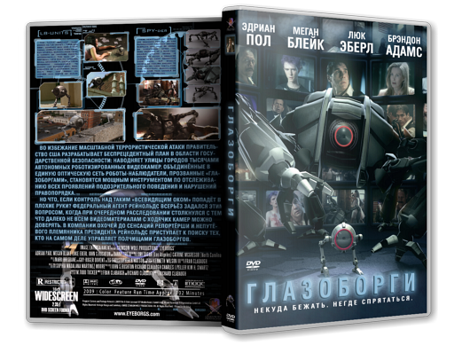 Мировая премьера: 29 апреля 2009 Релиз на DVD: 20 января 2011, «Вольга»Описание: Для эффективной борьбы с терроризмом правительство США разрабатывает беспрецедентный план: наводняет улицы городов тысячами роботов-видеокамер, названных «айборгами». Объединённые в единую сеть они становятся мощным инструментом по отслеживанию всех проявлений подозрительного поведения. В ходе очередного расследования федеральный агент Рейнольдс всерьёз задается вопросом: а если контроль над таким «всевидящим оком» попал не в те руки? И тогда Рейнольдс приступает к поиску тех, кто на самом деле управляет полчищами айборгов.Рейтинг kinopoisk.ru: 4.018 (148) imdb.com: 5.00 (639) MPAA: R - Лицам до 17 лет обязательно присутствие взрослогоКачество: DVD9 Формат: MPEG-PS Видео: MPEG-2 Video; 720x576 (16:9); 6473 Kbps; 25 fps; Interlaced (Top Field First); 0,624 bpp Аудио: AC3; 448 Kbps; CBR; 6 ch (Русский, Английский) Аудио: DTS; 754 Kbps; CBR; 6 ch; 16 bit (Русский) Субтитры: РусскиеРелиз: Раздача: